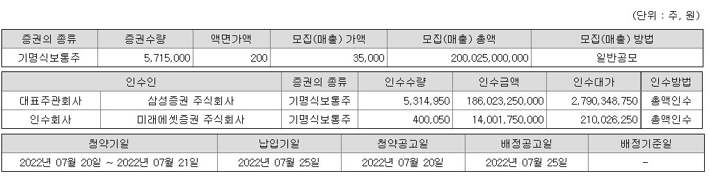 - 공모청약일 : 7월 20일(수) ~ 7월 21일(목)