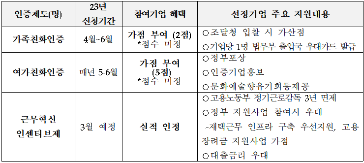 1. 참여기업 : 참여증서 발급, 정부인증 가점 부여 및 실적 인증(가족친화인증,여가친화인증,근무혁신인센티브등)