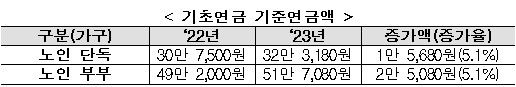 이에 따라 기초연금 수령 금액은 단독 가구 기준 2022년 30만 7,500원에서 32만 3,180원으로 인상되고, 부부 가구의 경우 2022년 49만 2,000원에서 2023년 51만 7,080원으로 인상됩니다.
