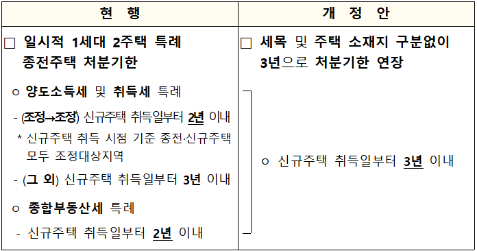 부동산 거래 침체롤 경기가 급감하면서 일시적 2 주택자가 처분기한(2년) 내 주택을 팔기가 어려워지자 퇴로를 넓혀주겠다는 취지로 보입니다.