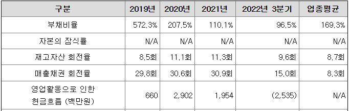 동사의 부채비율은 2019년 본사 이전에 따른 차입금 증가로 업종 평균 대비 높은 수준을 보였으나, 이후 무상 증자 등을 통해 부채비율이 개선되어 업종 평균을 하회하고 있습니다.