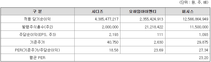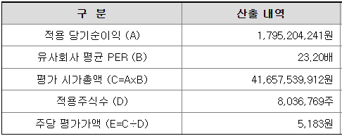 회사의 주당 평가가액은 2022년 3분기말 직전 4개 분기 순이익에 유사회사의 평균 PER배수를 적용하여 회사 가치를 정하고 주식 수로 나누어 산정한 것입니다.
