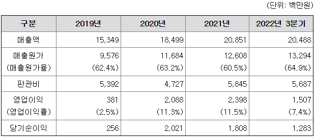 꿈비의 매출은 제품 기준으로 2019년 153억원에서 2020년 185억원, 2021년 204억원의 실적과, 2022년 3분기말 현재 170억원의 실적을 기록하여 지속적인 신장세를 보이고 있습니다.