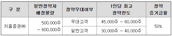 키움증권의 일반 청약자 배정 주식 수는 500,000주 ~ 600,000주이고, 일반 청약자의 최고 청약 한도는 일반 고객 기준 30,000주 ~ 40,000주입니다.