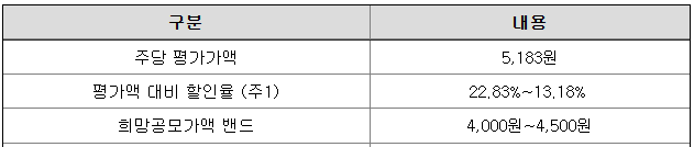 꿈비의 희망 공모가격은 회사의 주당 평가가액 5,183원에서 13.18% ~ 22.83% 할인한 가격입니다.