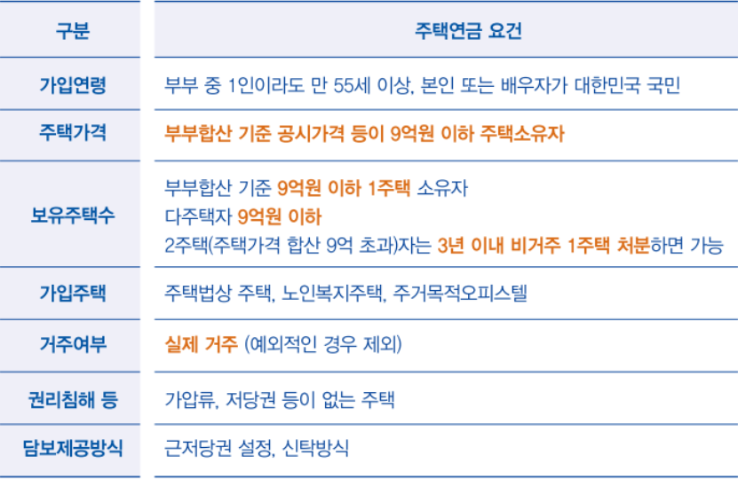 한편, 주택금융공사가 취급하고 있는 주택연금은 ① 부부 중 1인이라도 만 55세 이상이며 본인 또는 배우자가 대한민국 국민이고, ② 부부합산 기준 공시가격이 9억원 이하인 주택 소유자로 주택법상 주택, 노인복지주택, 주거 목적 오피스텔을 보유하고 있는 경우 ③ 가입 주택에 실제 거주 등의 가입 요건이 있었습니다.