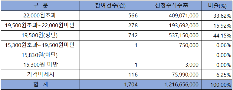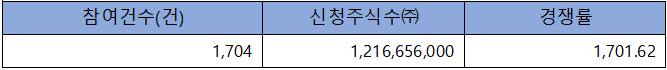 수요예측 참여 건수는 총 1,704건에 신청 주식수 1,216,656,000주로 경쟁률 1,701.62 : 1의 아주 좋은 실적을 기록했습니다.