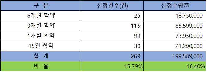 의무 보유 확약 건수는 269건에 199,589,000주로 전체 신청 물량 대비 건수로는 15.79%, 수량으로는 16.40%였으며 특히 3개월 이상 확약 비율도 높게 나타났습니다.