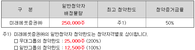 미래에셋증권의 일반 청약자 배정 물량은 250,000주이고, 일반 청약자의 최고 청약 한도는 일반 그룹 기준 12,500주입니다.