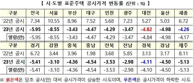 표준주택 25만호에 대한 공시가격도 표준지와 마찬가지로 의견 청취 전 후 변화 없이 지난해보다 5.95% 하락한 것으로 나타났으며, 표준 주택의 멸실에 따른 표본교체 및 주택 특성과 이용 상황 등이 반영되어 대전, 세종, 경북에서는 하락폭에 변동이 있었습니다.