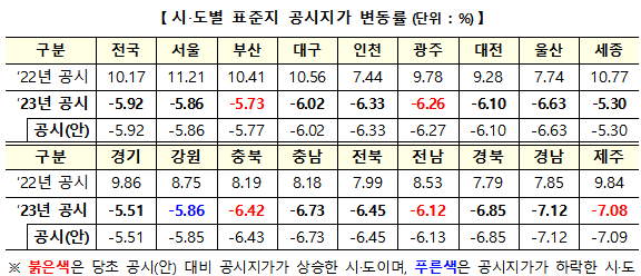 2023년 표준지 및 표준주택 공시가격 5.9%하락 결정