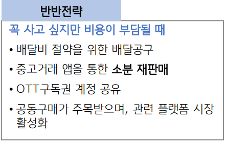 꼭 사고 싶지만 비용이 부담될 때 지인과 공동 구매 형태로 사서 나누어 가지는 현상은 물론이고, 물건을 사고 나서 중고 거래 시장에서 되파는 소비자가 나타나는가 하면, OTT구독 계정을 함께 나누어 쓰는 현상도 나타나고 있습니다.