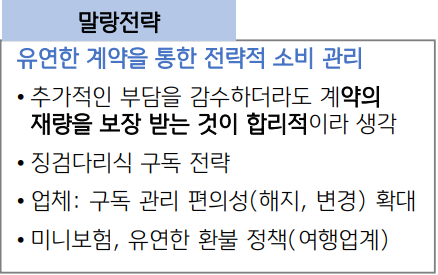 소비자에 따라서는 쿠팡등에서 제공하는 구독 서비스를 선호하는 사람도 있겠지만, 말랑전략에 입각해서 구독 서비스를 사용하지 않거나 사용하라도 곧바로 해지하는 소비자가 늘어나고 있는 것입니다.