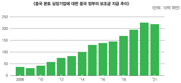 중국은 2015년에 발표한 '중국제조 2025'달성을 위해 전기차, 반도체 제조업체 등 핵심 기업에 대한 정부 보조금 지원을 지속 확대하고 있습니다.