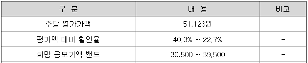 희망 공모가격은 30,500원 ~ 39,500원이고, NH투자증권과 한국투자증권에서 청약 가능합니다.