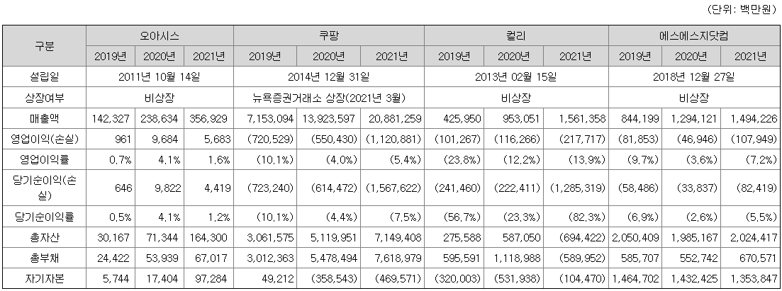 국내 식품 새벽 배송 시장에는 많은 업체들이 후발주자로 참여했으나 출혈 경쟁에 따른 적자를 견디지 못하고 철수한 경우가 많이 발생하였으며, 현재는 오아시스 외 쿠팡, 에스에스지닷컴등 4개 업체만이 새벽 배송 사업을 운영하고 있고, 그중 영업이익 흑자를 시현하고 있는 업체는 오아시스가 유일합니다.