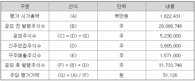 한편 금번 공모가 성공리에 이루어질 경우 회사 가치는 희망 공모가 하단에서 상단 기준 약 9,680억원에서 약 1조2척원원 정도로 추정됩니다.