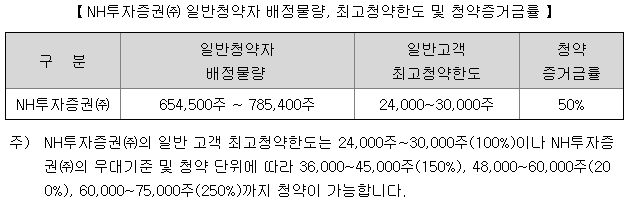 일반 청약자의 최고 청약 한도는 NH투자증권의 경우 일반 고객 기준 24,000주 ~ 30,000주이며, 한국투자증권의 경우 일반고객 기준 10,000주 ~ 13,000주입니다.