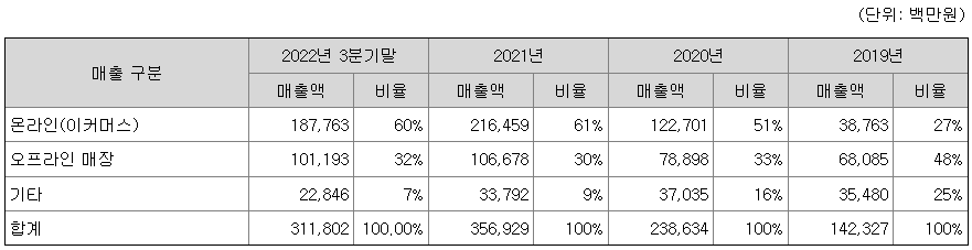오아시스의 매출액은 2019년 1,423억에서 2021년 3,569억원 2022년 분기까지 3,118억원의 매출 성장을 기록하고 있고, 그중에서 온라인 매출액의 경우 2019년 387억원에서 2022년 3분기 1,877억원까지 급성장을 보이고 있습니다.