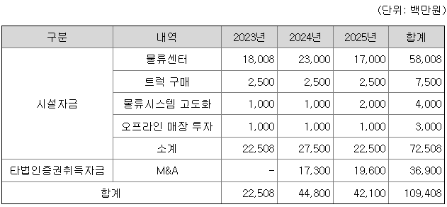 오아시스는 금번 공모를 통해 조달된 자금으로 물류센터 확충 등 시설 자금에 725억원을 사용하고, 타 법인 M&A자금으로 369억원을 사용할 계획입니다.