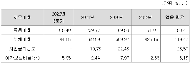 동사의 유동비율은 2022년 3분기 기준 315.46%를 기록해 업종 평균을 상회하고 있으며, 부채비율 역시 44.55%로 업종 평균 대비 양호한 실적을 나타내고 있습니다.