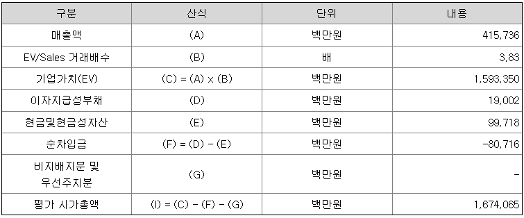 주당 평가가액은 회사의 2022년 3분기 매출 실적을 연환산한 후 유사회사의 EV/Sales(시가 총액을 매출 실적으로 나눈 값) 배수를 적용하여 회사 가치를 정하고 이를 주식수로 나누어 산출한 것입니다.