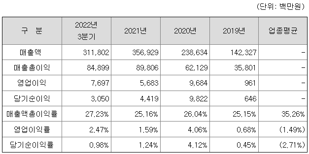 수익성 측면에서는 2022년 3분기 및 최근 3개년 모두 영업이익과 당기순이익을 시현하고 있으며, 업종 평균을 상회하는 양호한 실적을 나타내고 있습니다.