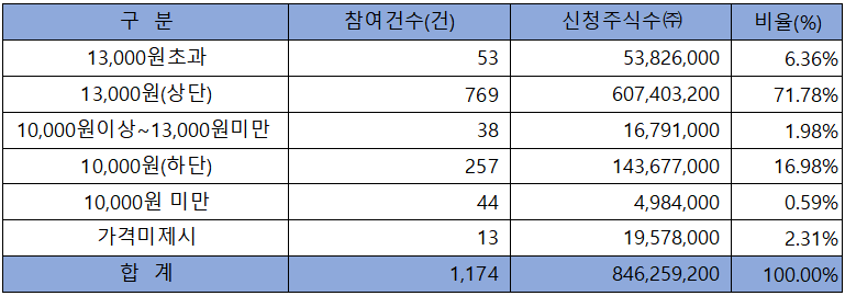 수요예측 참여 건수는 총 1,174건에 신청 주식수 846,259,200주로 경쟁률 352.61 : 1의 실적을 기록했습니다.