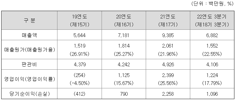 이노진의 매출액은 2019년 56억원에서 2021년에 94억 2022년 3분기말 현재 69억의 실적을 달성하였고, 2022년 말까지는 2021년의 실적을 뛰어넘을 것으로 전망되고 있습니다.
