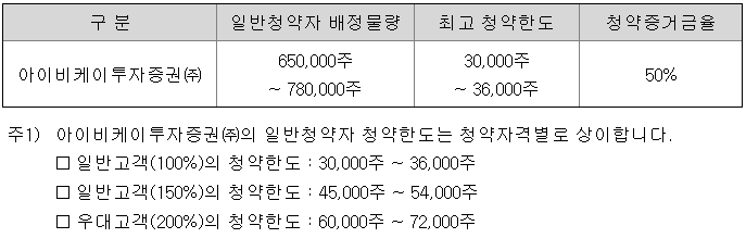 IBK투자증권의 일반 청약자 배정 물량은 650,000주 ~ 780,000주이고, 일반 청약자의 최고 청약 한도는 일반 고객 기준 30,000주 ~ 36,000주입니다.