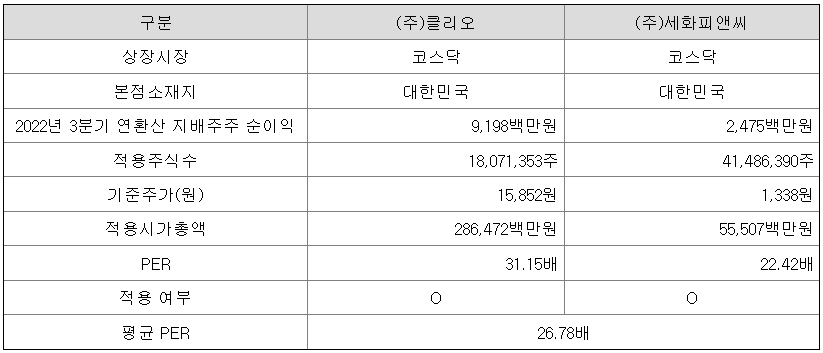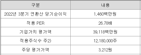 회사의 주당 평가가액은 회사의 2022년 3분기말 순이익을 연환산 한 후, 유사회사의 평균 PER배수를 적용하여 회사가치를 구하고 주식 수로 나누어 산출한 것입니다.