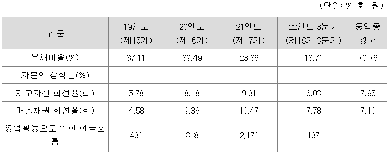 동사의 부채 비율은 2022년 3분기말 현재 18.71%로 동업종 평균을 훨씬 하회하고 있으며, 현재 무차입 경영을 하고 있습니다.