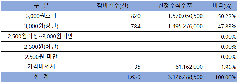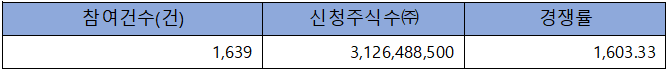 수요예측 참여 건수는 총 1,639건에 신청 주식수 3,126,488,500주로 경쟁률 1,603.33 :1의 아주 좋은 실적을 기록했습니다.