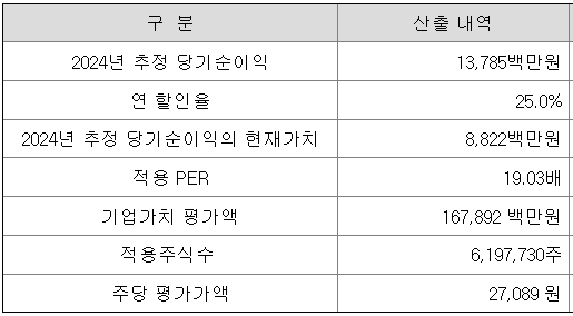 회사의 주당 평가가액은 2024년 추정 순이이익을 현가 환산 한 후 유사회사의 평균 PER배수를 곱하여 회사가치를 정하고 주식수로 나누어 산출한 것입니다.