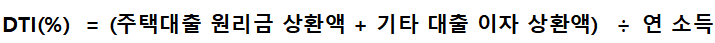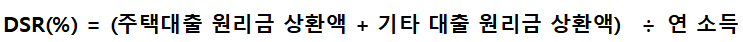 세부적으로는 주택 담보 대출의 연간 원리금 상환액과 기타 대출의 이자 상환액을 더한 금액을 연간 소득으로 나누어 구하게 됩니다.