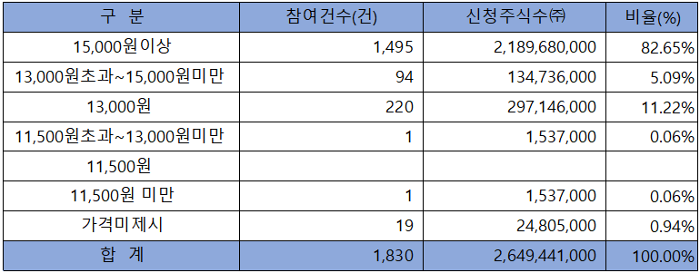 희망 공모가격 상단 이상 신청 비율은 98.96%였고, 희망 공모가 상단 13,000원 초과 신청 비율도 87.74%였으며, 특히 15,000원 이상 신청 비율이 82.65%에 달해 높은 가격 분포를 보여주었습니다.