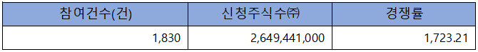 수요예측 참여 건수는 총 1,830건에 신청 주식수 2,649,441,000주로 경쟁률 1,723.21 : 1의 매우 좋은 실적을 기록했습니다.