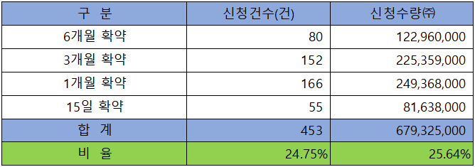 의무 보유 확약 건수는 453건에 679,325,000주로 전체 신청 물량 대비 건수로는 24.75%, 수량으로는 25.64%로 높은 확약 비율을 보였고, 6개월 보유부터 15일 보유까지 고른 분포를 나타냈습니다.