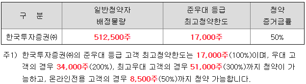 한국투자증권의 일반 청약자 배정 물량은 512,500주이고, 일반 청약자의 최고 청약 한도는 온라인 전용 고객의 경우 8,500주입니다.