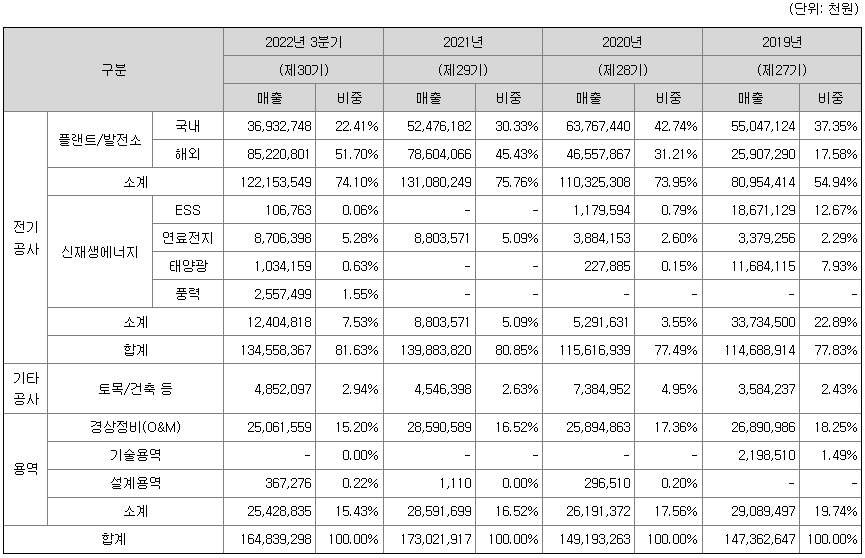 사업 초기 일반 상업 시설에서 시작하여 국내 플랜트로 사업 영역을 확장시켰고, 해외 플랜트 사업에도 진출한 바 있으며, 국내 신재생에너지 시장 개화기를 포착하여 전기공사의 주요 공종을 연료전지, 에너지 저장장치 등 신재생에너지 분야로 확장시킨 후, 다시 신재생에너지 발전 사업 개발과 발전 설비 운영 및 경상 정비까지 사업 영역을 확장시켜 왔습니다.