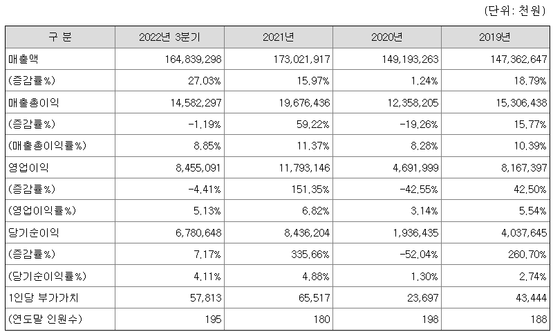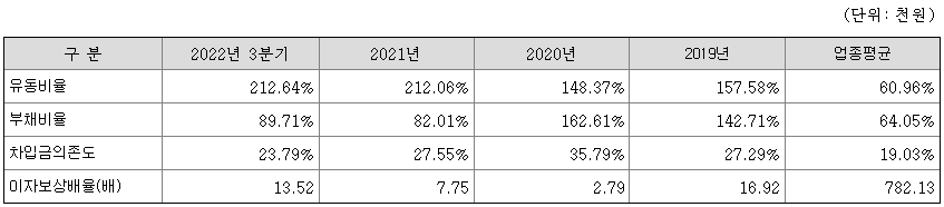 동사는 유동비율, 부채비율 및 차입금 의존도 등에서 안정적인 실적을 기록하고 있으며, 2021년 이후 이자보상배율도 크게 늘어나는 모습을 보이고 있어 안정적이라고 하겠습니다.