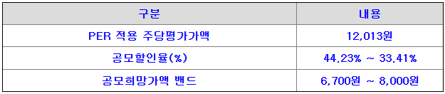 금양그린파워의 희망 공모가격은 회사의 주당 평가가액 12,013원에서 33.41% ~ 44.23% 할인한 가격입니다.