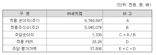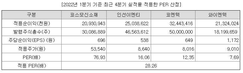 회사의 주당 평가가액은 2021년 4월 ~ 2022년 3월까지의 순익익 6,749백만원에 유사 회사의 평균 PER 28.26배를 적용하여 산출되었습니다.