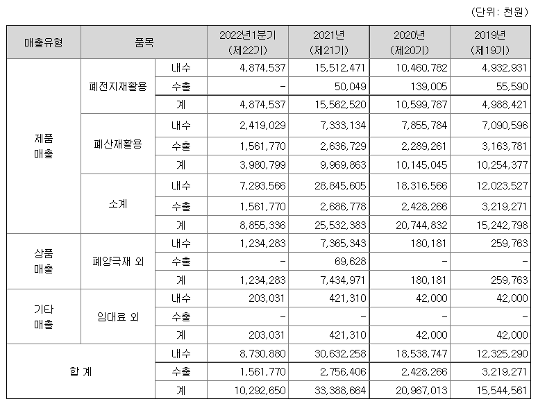 회사의 매출액은 폐전지(폐배터리) 재활용 사업의 신장으로 2019년 155억원에서 2021년 333억원으로 신장되었습니다.
