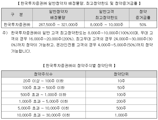 한국투자증권의 일반청약자 청약 한도는 8,000주 ~ 10,000주입니다.