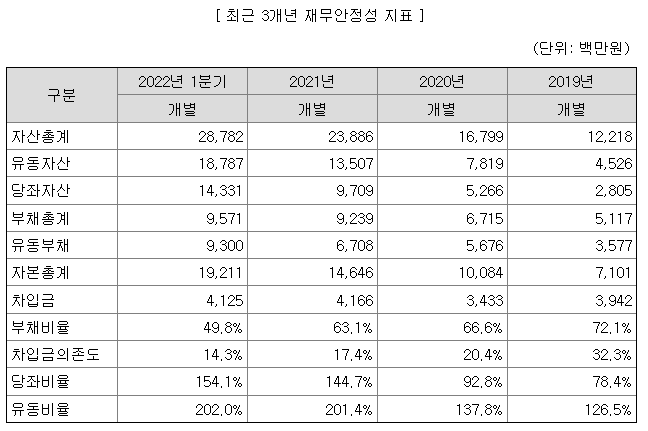 차입금 의존도도 14.3%로 낮은 수준이며 당좌비율과 유동비율도 높은 수준을 유지하고 있어 안정적인 재무 상태를 보이고 있습니다.