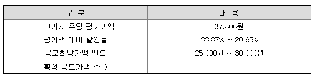 새빗캠의 공모희망가격은 회사의 주당 평가가액 37,800원에서 20.65% ~ 33.87%를 할인한 가격입니다.