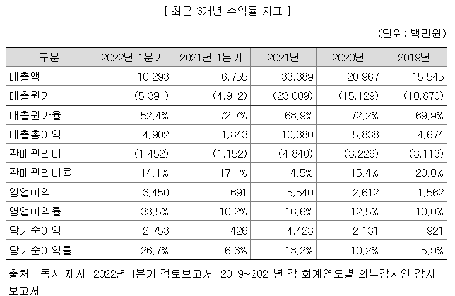 회사의 영업이익률은 2019년 10.0%에서 2020년 12.5%, 2021년 16.6%, 2022년에는 33.5%까지 개선되고 있습니다.