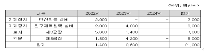 시설 자금 투자 중에는 신사업 탄산리튬 설비 투자 20억원이 포함되어 있습니다.