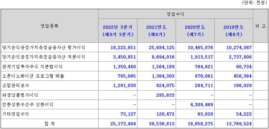 액셀러레이터의 영업 수익은 당기손익 공정가치 측정 금융자산 평가이익과 처분이익 및 기타 매출로 이루어집니다.